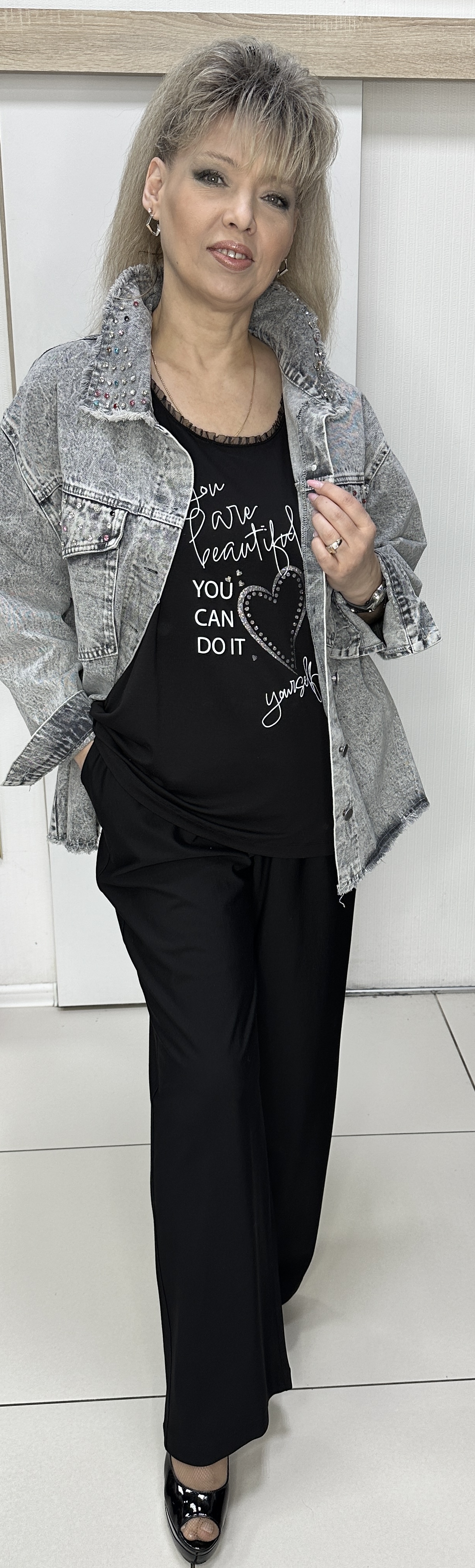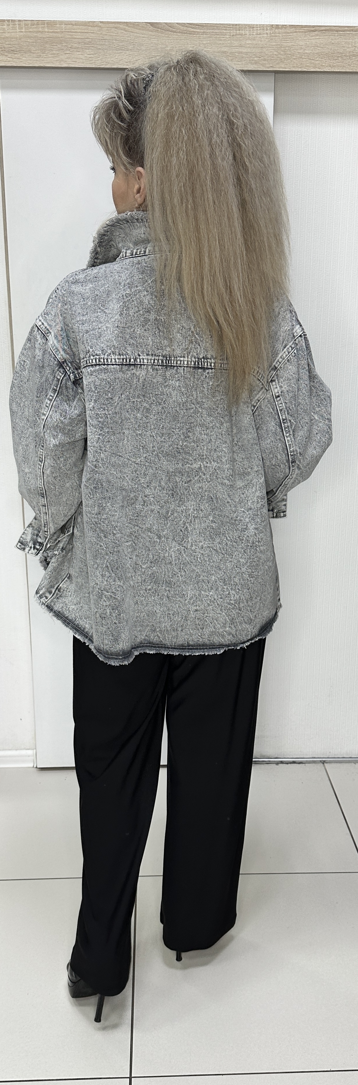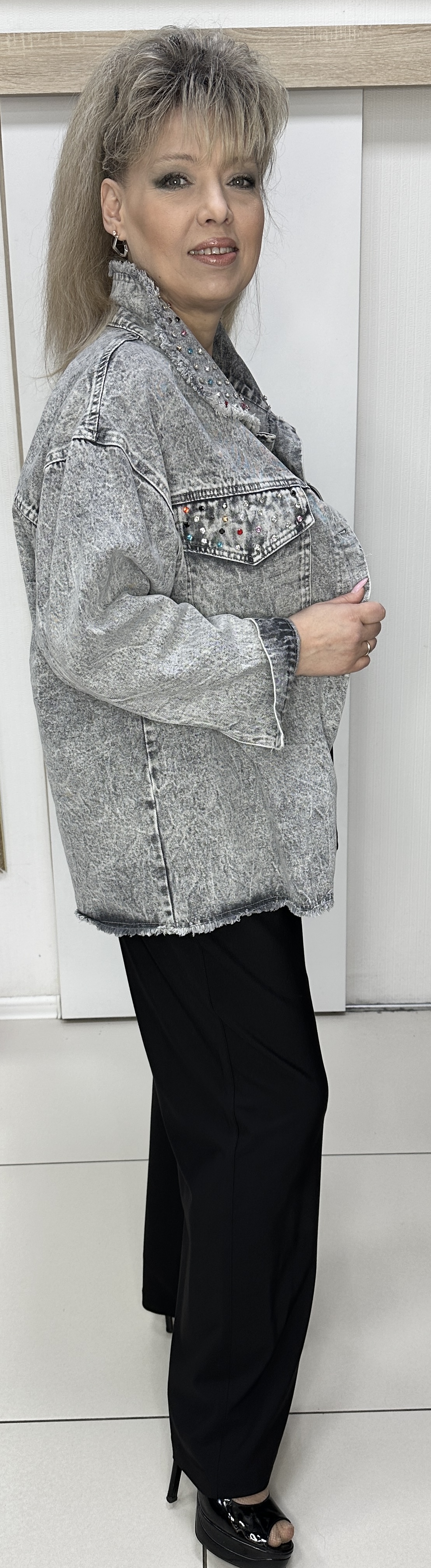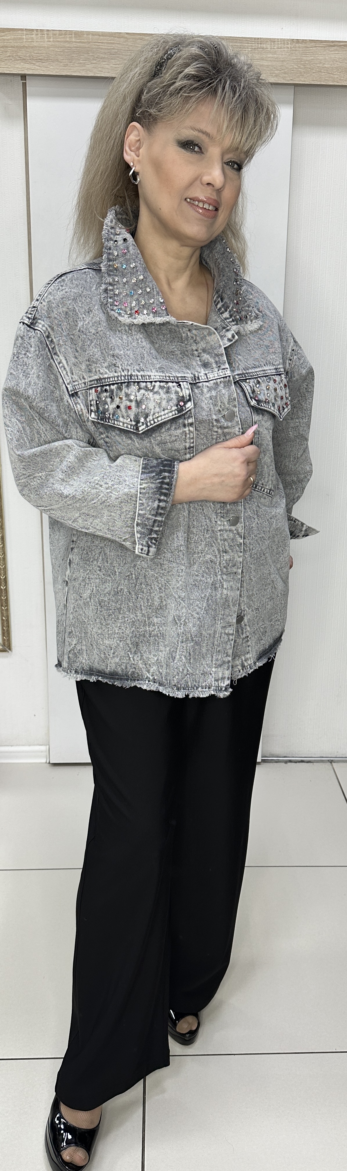 Светло-серый с потертостью джинсовый жакет-бомбер из хлопка с отделкой не длинной бахромой по воротнику и низу изделия модель 512 на каждый день. Джинсовая ткань с накладными кармашками и клапанами украшенными цветными камушками - делают эту модель весьма актуальной и очень современной. Этот бомбер хорошо сочетается с любым низом и незаменимо в прохладный день. Прекрасный вариант повседневной весенне-летней одежды. В наличии большие размеры.